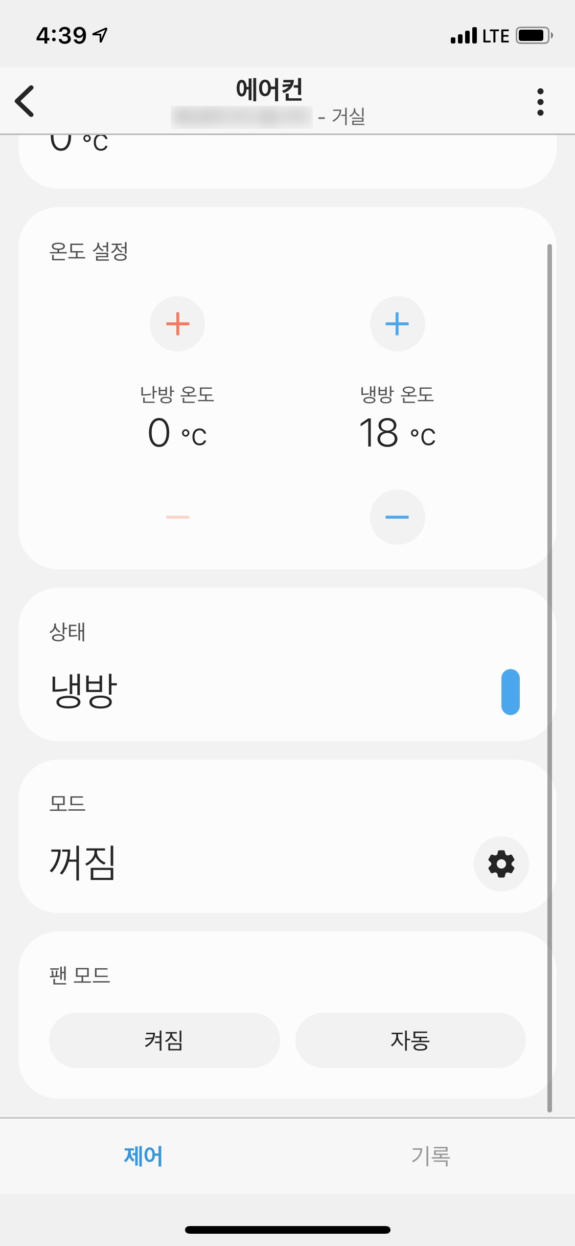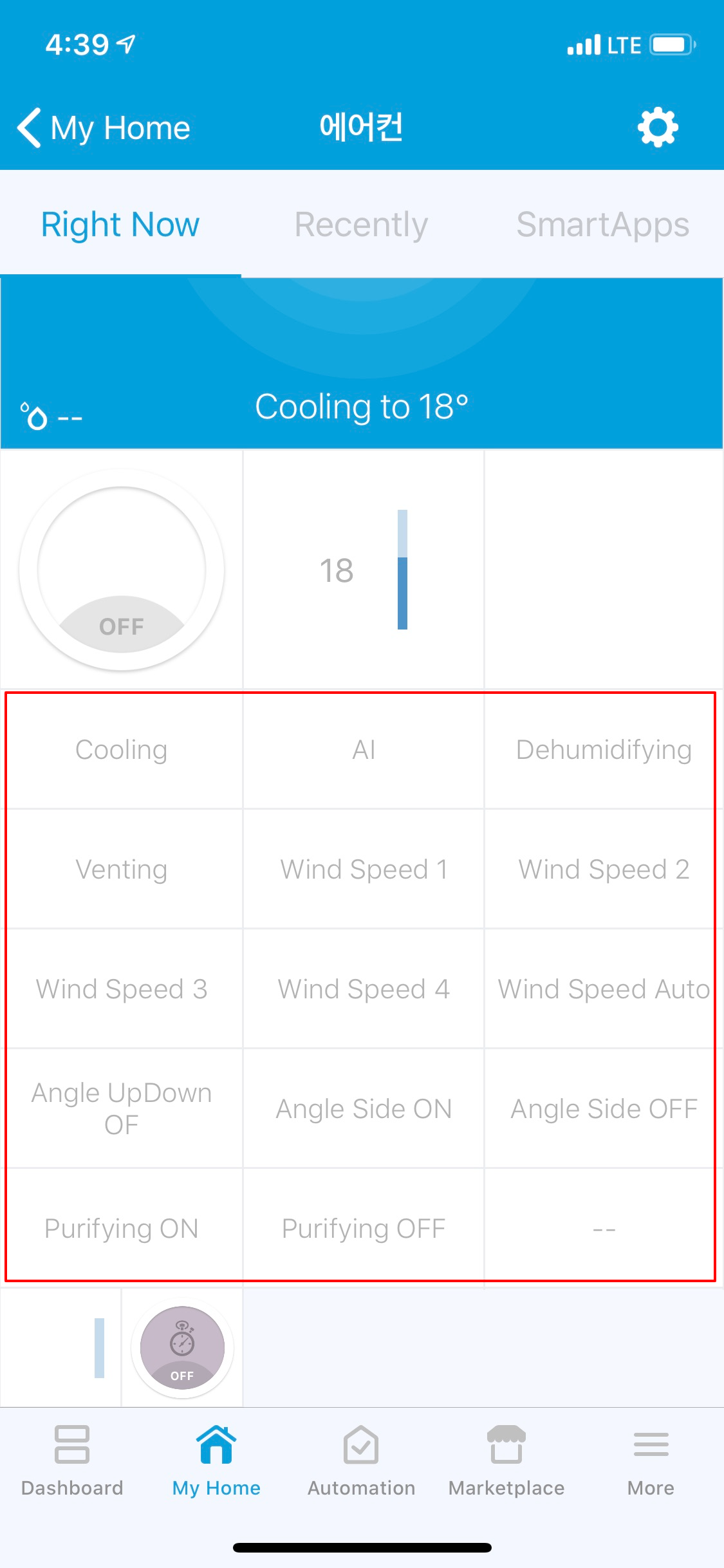 스마트싱스 뉴앱에서 에어컨을 컨트롤할 수 있는 부분은 극히 제한적이며