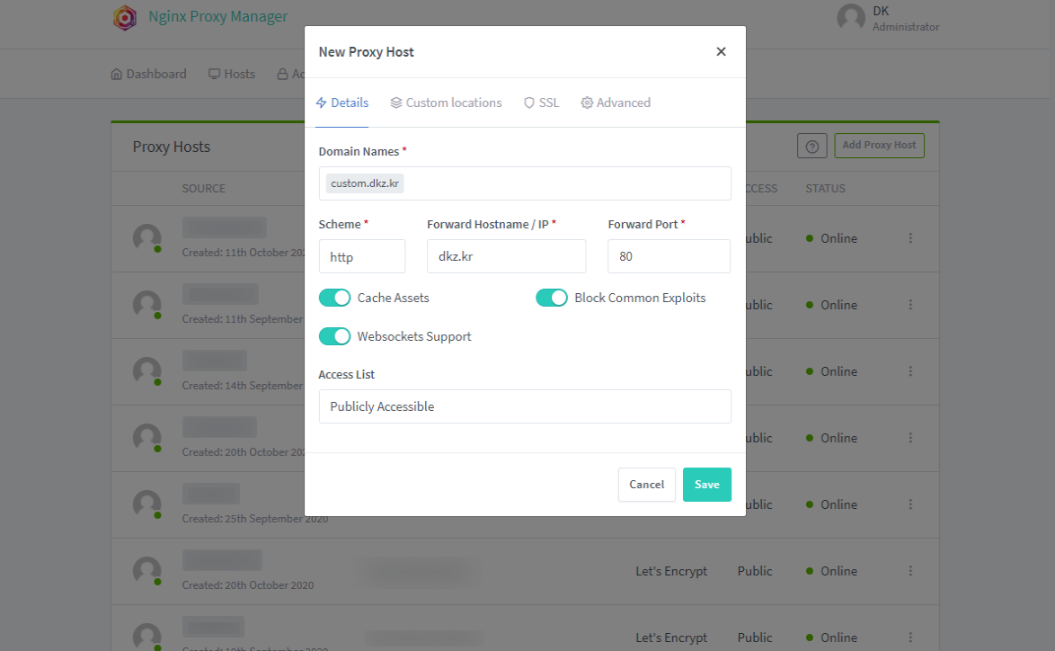 나는 일단 Proxy Hosts만 사용하고 있다.